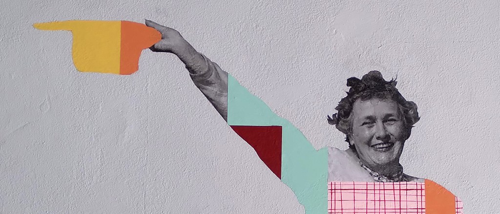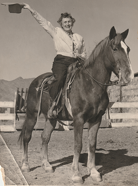 Like many of my murals, this is a love poem to Tucson. My childhood in Connecticut was filled with my mom’s tales of growing up in the Old Pueblo. Part of a post-war migration, made possible by the allure of newfangled air conditioning and a promise that the desert air “would cure what ails ya,” twenty-six-year-old Richard Norton followed the siren call of the Sonoran Desert and moved his family west in 1951. Alas, the climate could not cure nephritis, and Richard died shortly after arriving. But the family stayed, and so his mother, Joan Norton, continued to make the long journey from her farm in Switzerland to visit her grandbabies here in Tucson. The photograph used in the mural was captured on one such visit as she tried out the “cowgirl look,” posing for my eight-year-old mother off camera.